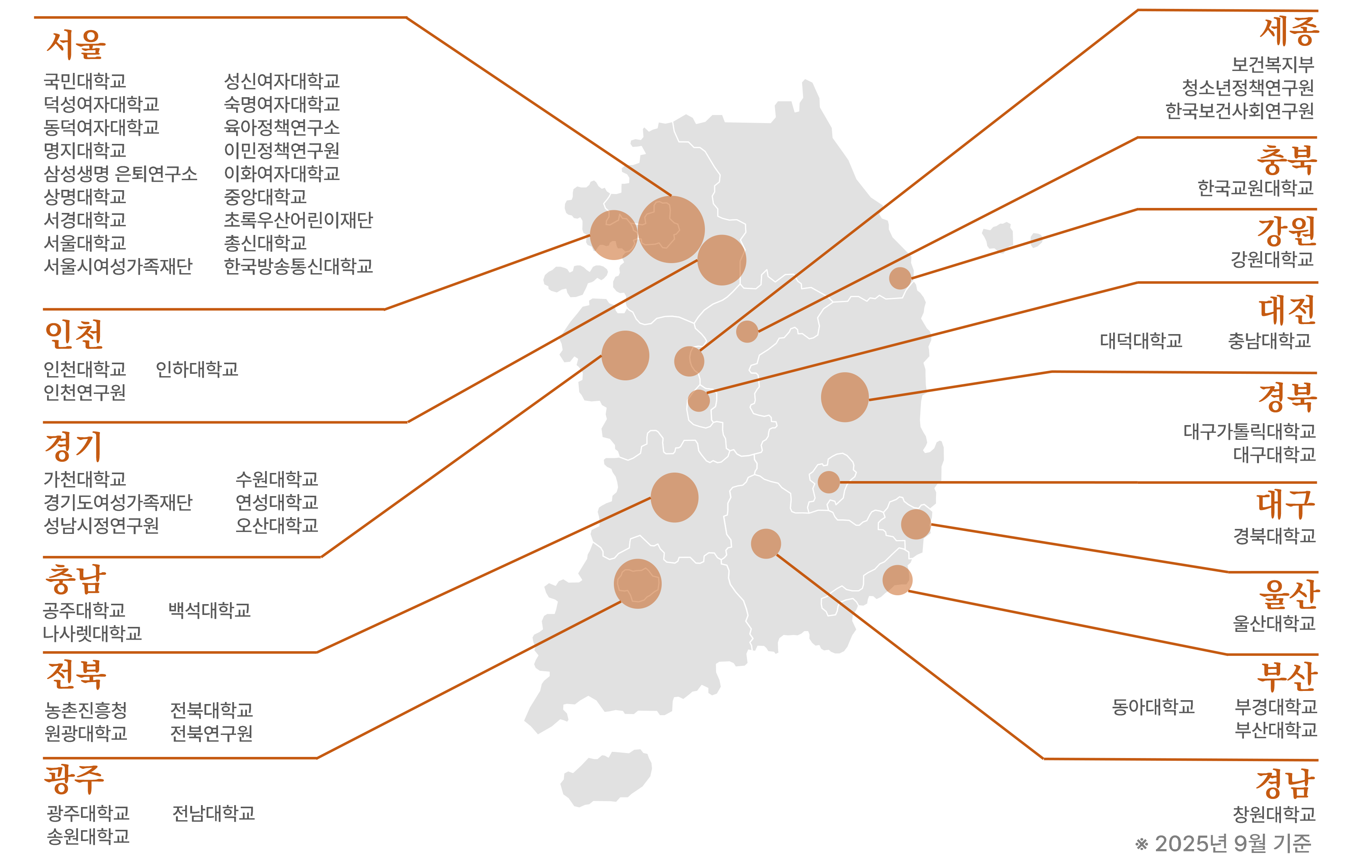 아동가족학 분야에서 교육 및 연구를 통해 한국사회 뿐만 아니라 국제사회에 기여하고 있는 졸업생들이 활동하고 있는 지역과 기관은 다음과 같습니다.